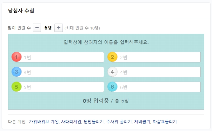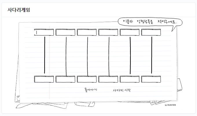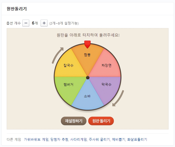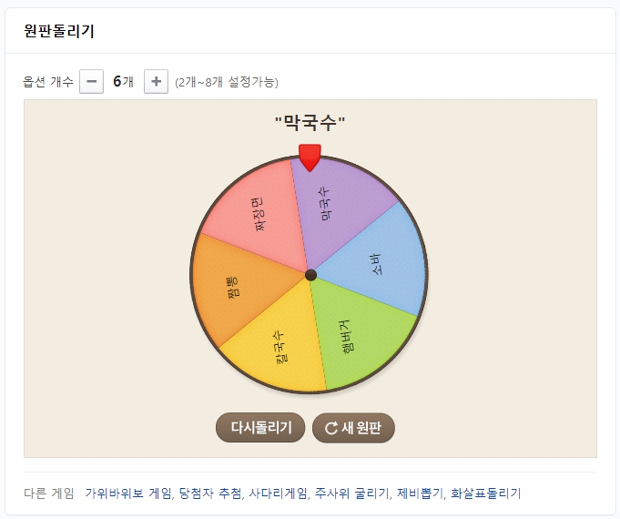 . 그리고 원판돌리기를 하니까 막국수가 걸렸네요. 오늘 점심은 막국수로 진행시켜야겠어요. 그 외에도 가위바위보, 당첨자 뽑기, 사다리 게임, 주사위, 제비뽑기, 화살표 돌리기 게임도 있으니까 한번씩 사용해보세요.