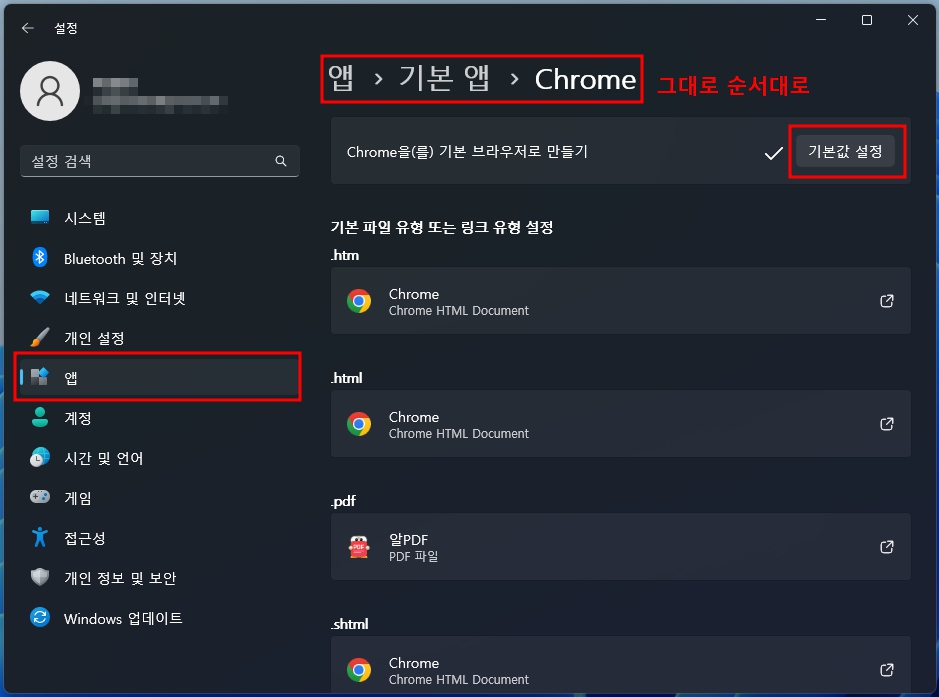 *저는 윈도우 운영체제 11 버전이라서 앱 > 기본 앱> 크롬으로 가서 기본값 설정을 클릭을 하니 모든 설정이 자동으로 기본웹 브라우저로 설정이 간단하게 마무리가 되었습니다. 방법 2 Edge 폴더 이름 변경