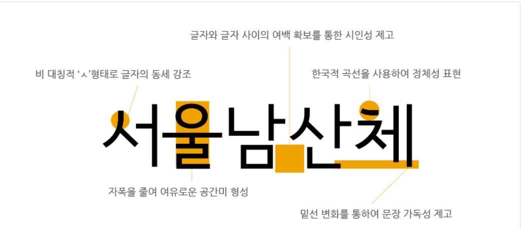 이는 시청의 각종 표지판에서부터 시설 안내판, 시청의 이동 수단, 그리고 주민센터의 표지판에 이르기까지 다양한 곳에서 볼 수 있습니다. 서울남산체의 디자인은 서울 도시의 깊은 역사성, 뚜렷한 전통성, 풍부한 문화성, 그리고 사회적인 의미를 담아내고자 하였습니다.