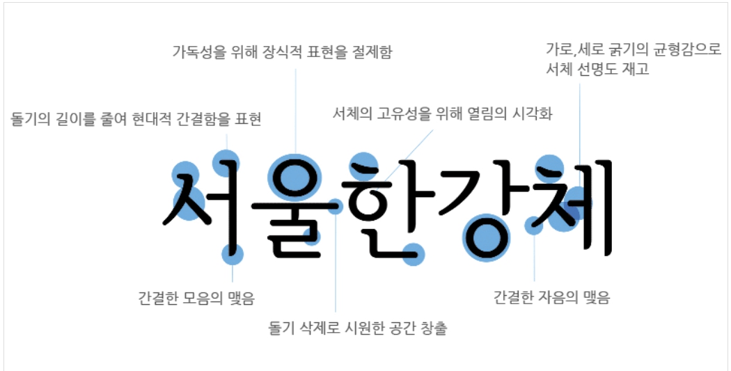한옥의 유려한 공간과 기와의 아름다운 곡선미를 시각적으로 재현해냈습니다. 또한, 서울의 아름다운 랜드마크인 '한강'과 '남산'을 이용하여, 우리의 아름다운 언어인 한글에 대한 문화적 자부심을 더욱 상승시키고 있습니다. 서울남산체는 윤디자인 업체의 제안 후 서울시의 심사를 거쳐 선정되었고, 현재는 서울시청의 다양한 곳에서 사용되고 있습니다.