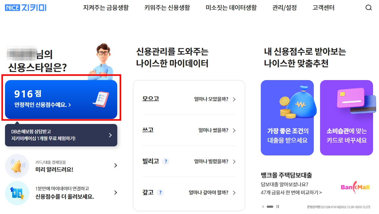 신용 점수 등급을 올리기 위해서는 먼저 나의 신용 점수 등급을 알아야 하잖아요. 나의 신용 점수는 나이스 지키미 어플이나 공식 홈페이지에서 확인할 수 있습니다.