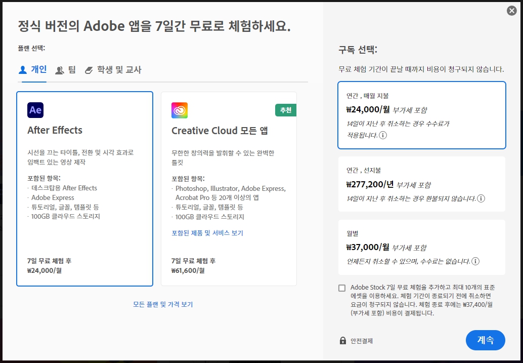 - 에펙은 크리에티브 클라우드 구독에 포함되어 있습니다. 다른 어도비 소프트웨어를 사용하실려면 구독을 생각해보세요.