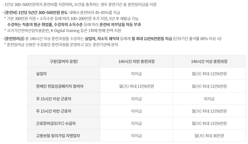이 지원은 대한민국 성인남녀들이 필요한 직업기술을 습득하도록 도와주기 위해 설계되었습니다. 교육비 지원은 내일배움카드로 제공되며, 이는 국가 인증 직업 훈련 기관에서 교육 과정을 이수하는 데 사용할 수 있습니다.