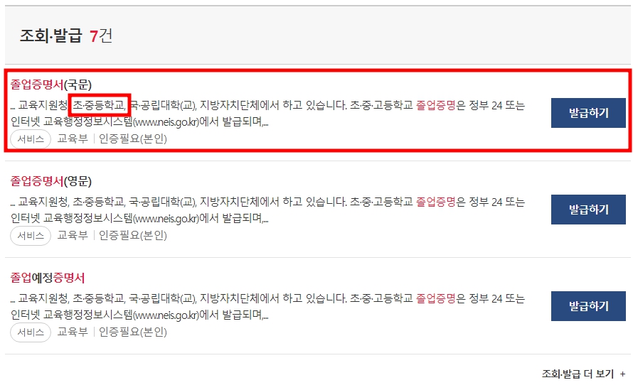 그러면 조회, 발급 7건, 신청, 신고 4건이 검색됩니다. 최종학력증명서는 초중고와 대학교 따로 발급이 되니 잘 확인하고 발급받으세요.