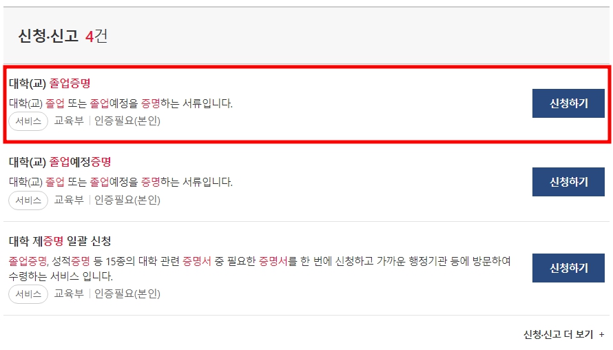 신청, 신고 4건은 대학교 졸업증명서입니다.