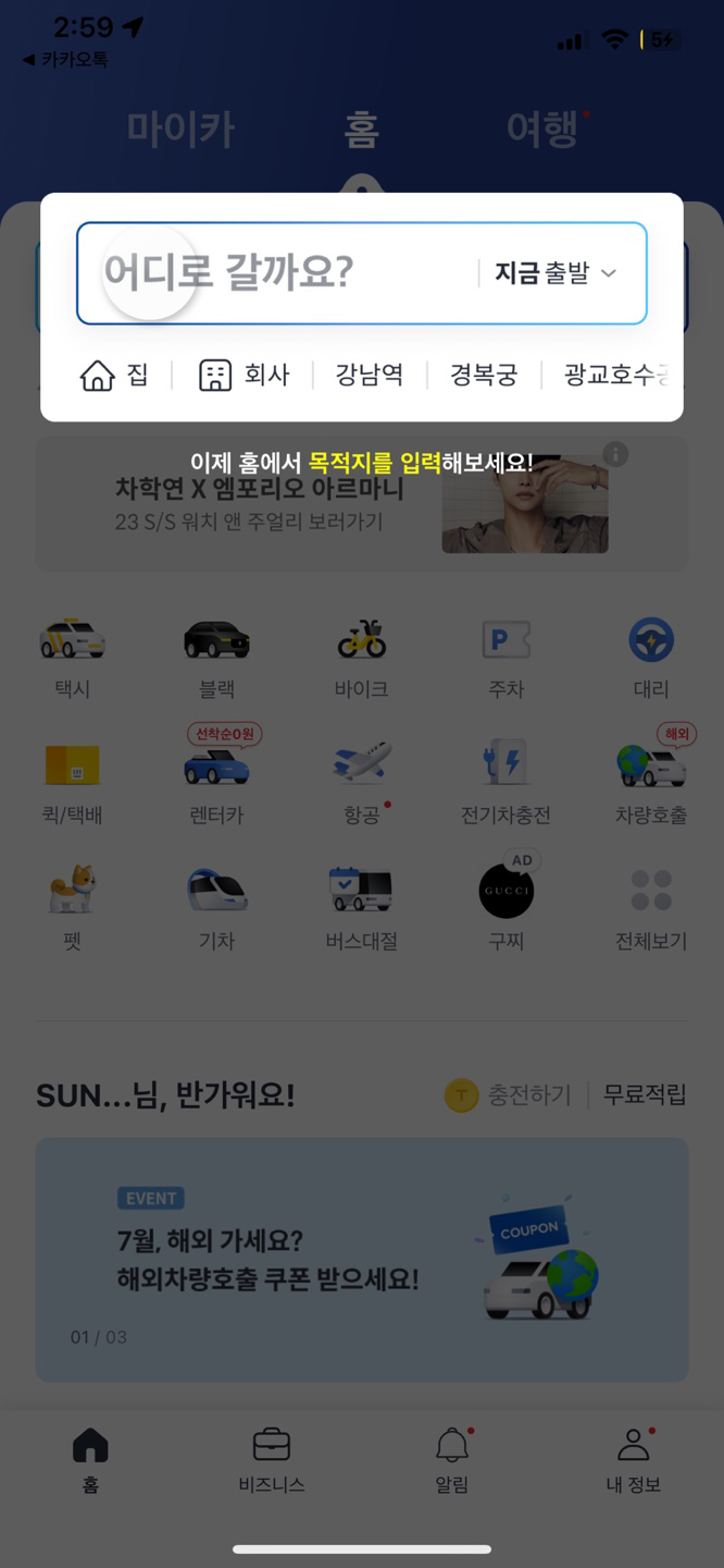 먼저 카카오T 어플이 없으시다면 어플을 설치하고 실행을 해주세요. 저는 카카오T 어플이 있어서 바로 실행합니다.