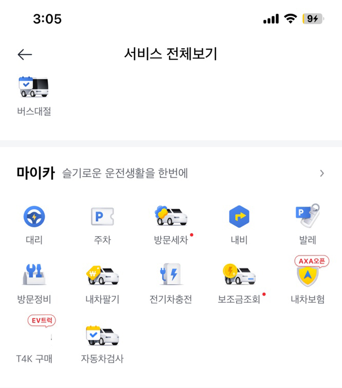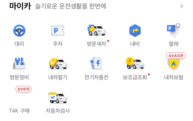 카카오T 어플은 카카오택시뿐만아니라 다양한 서비스를 지원합니다. 대리, 주차, 방문세차, 네비, 발레, 방문장비, 내차팔기, 전기차충전, 보조금조회, 배차보험, 자동차검사 등등 정말 다양하게 서비스하니까 필요한 것이 있다면 활용해보세요.