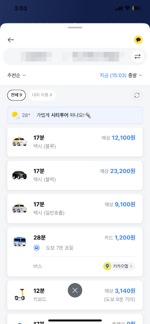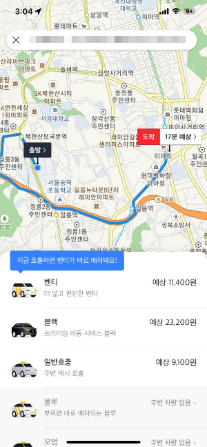 그리고 소용시간과 예상 택시비용이 나오면 보고 선택을 하시면 됩니다. 그리고 출발지와 도착지의 예상 시간과 함께 선택할 택시가 나옵니다. 그러면 나중에 선택한 택시가 오고 타고 가시면 됩니다. 저는 정리를하기 위해서 선택을 하지 못하고 여기까지 알려드리게되서 죄송합니다.