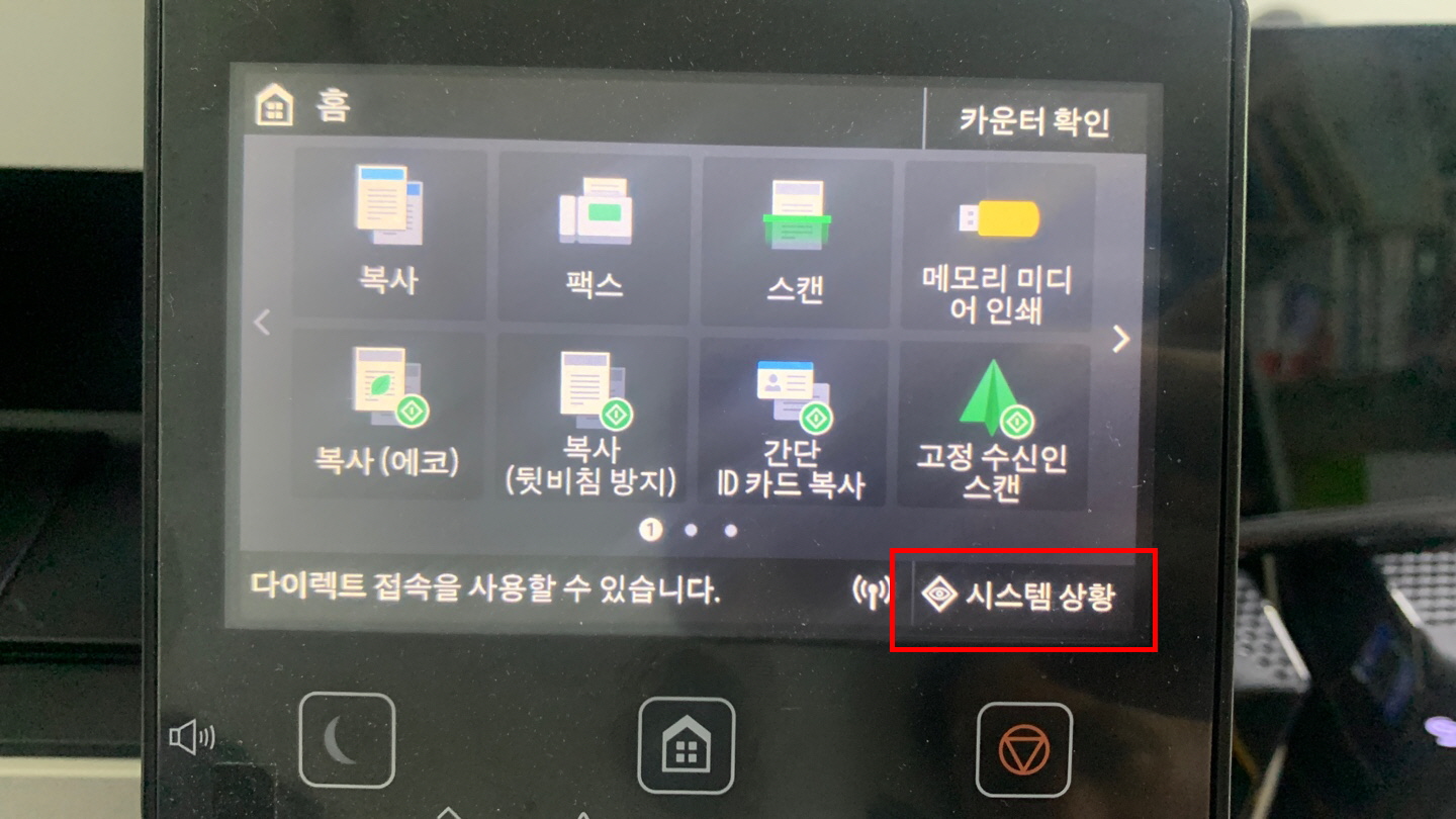 나의 프린터 기에서 홈화면에서 시스템 상황을 보실 수 있는데요. 터치해서 들어갑니다.