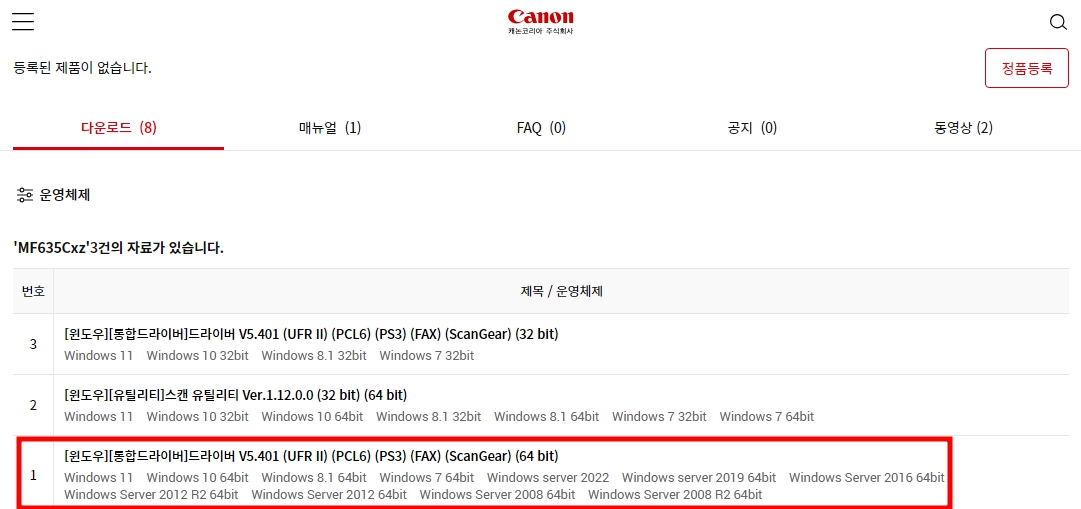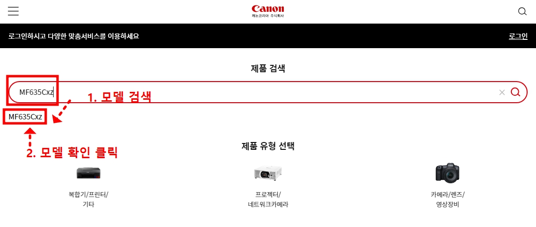 캐논 공식 홈페이지에 방문하면 아래와 같이 보이실 것입니다. 제품 검색에 모델 검색을 합니다. 저는 MF635Cxz로 검색을 했더니 아래와 같이 검색이 되었습니다. 모델을 확인하고 선택을 합니다.