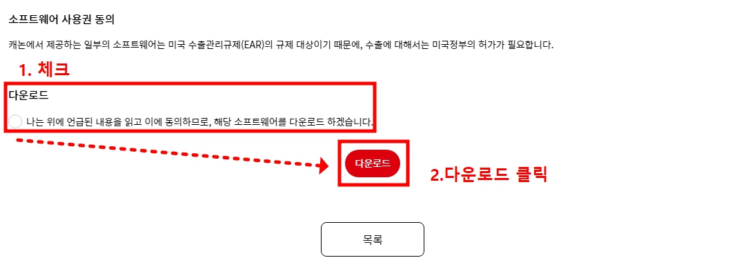 아래는 드라이버를 다운로드 하기 전에 소프트웨어 사용권 동의에 관한 내용들이므로 그냥 확인하시고 아래 체크하고 다운로드 합니다. 저는 그냥 쭉 대충 훌터 읽고 바로 다운받았어요.