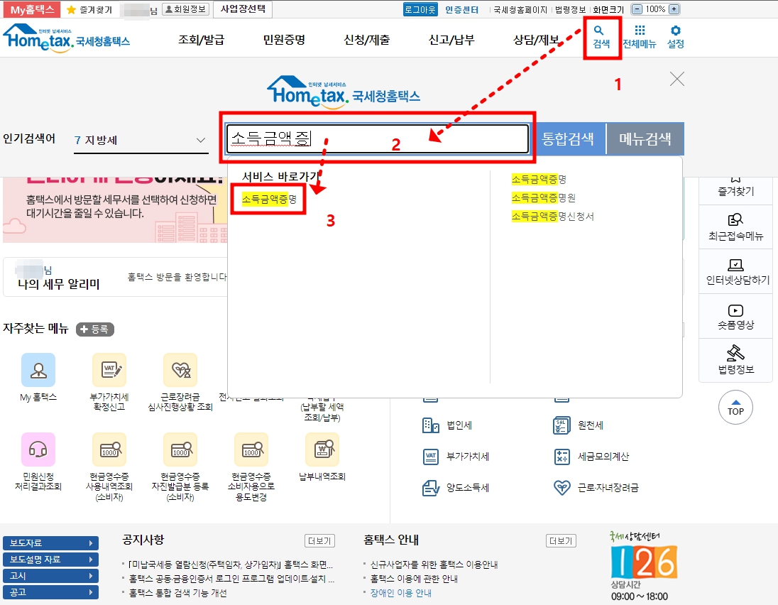 방문하셔서 검색을 하는데요. 검색창에 '소득금액증명'까지만 입력하시고 보시는 것과 같이 오른쪽에 서비스 바로가기에 있는 것을 선택해서 들어가주세요.