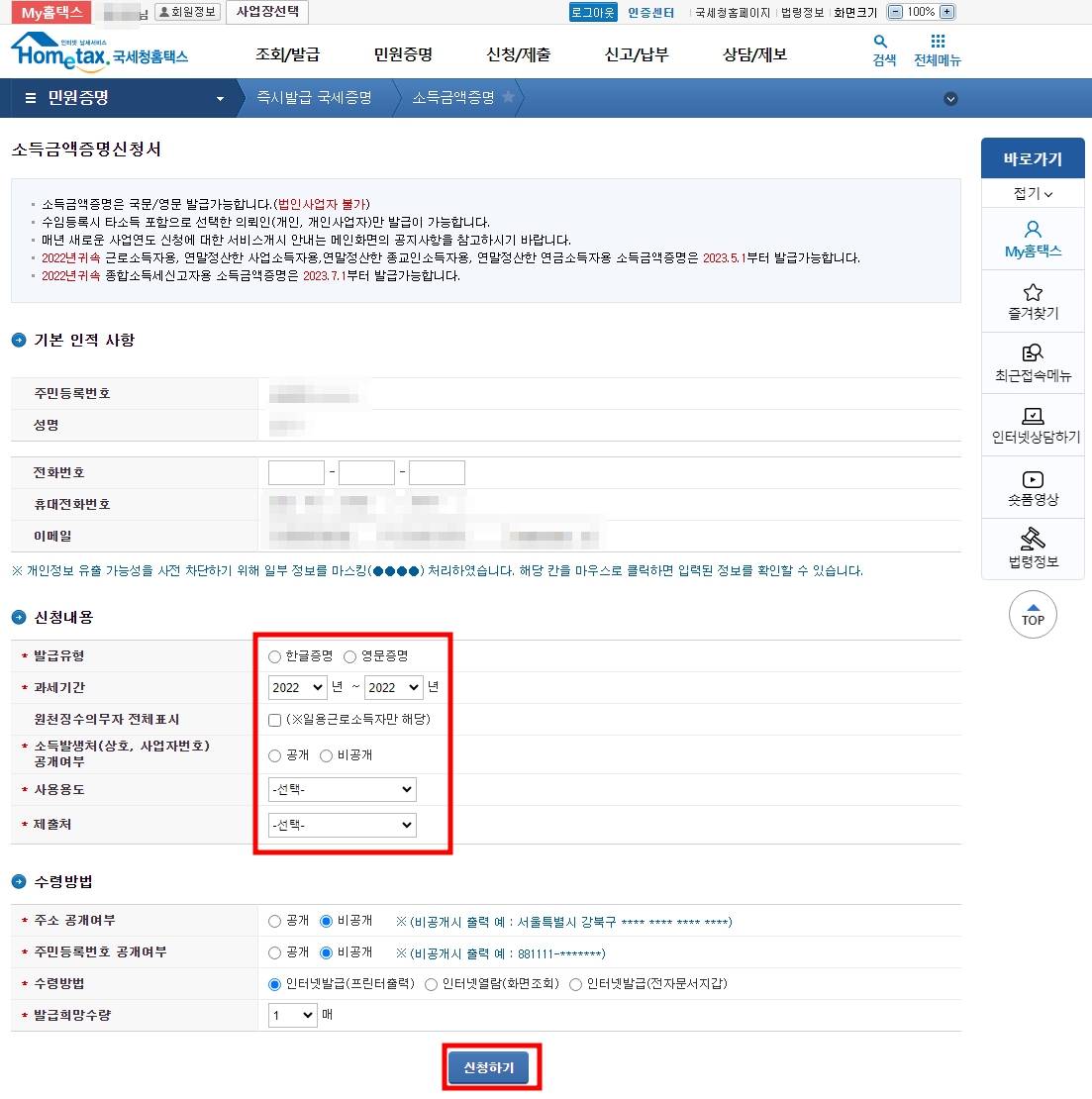 확인을 하면 자동으로 기본 인적 사항은 채워지는 경우가 있는데 만약 안되면 직접 입력을 하면 됩니다.나머지 신청내용과 수령방법에 대해서 정확하게 입력 또는 체크를 하고 신청하기를 클릭합니다.