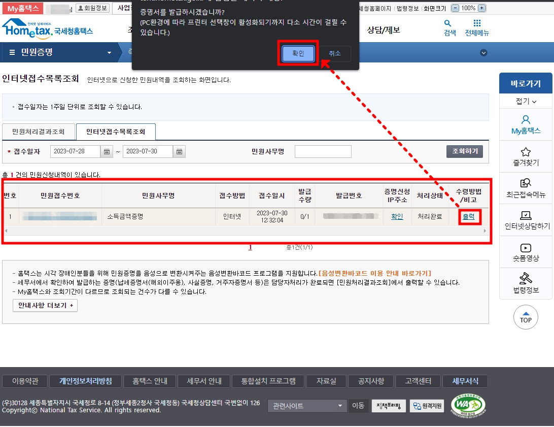 신청하면 증명서가 발급이 되고 출력을 선택하면 바로 인터넷으로 발급 즉 인쇄하겠냐는 질문 창이 뜨는데 확인을 선택하고 출력될 소득금액증명서가 보여집니다. 프린트 모양의 아이콘을 선택해서 바로 출력을 하면 발급은 완전히 완료가 됩니다.