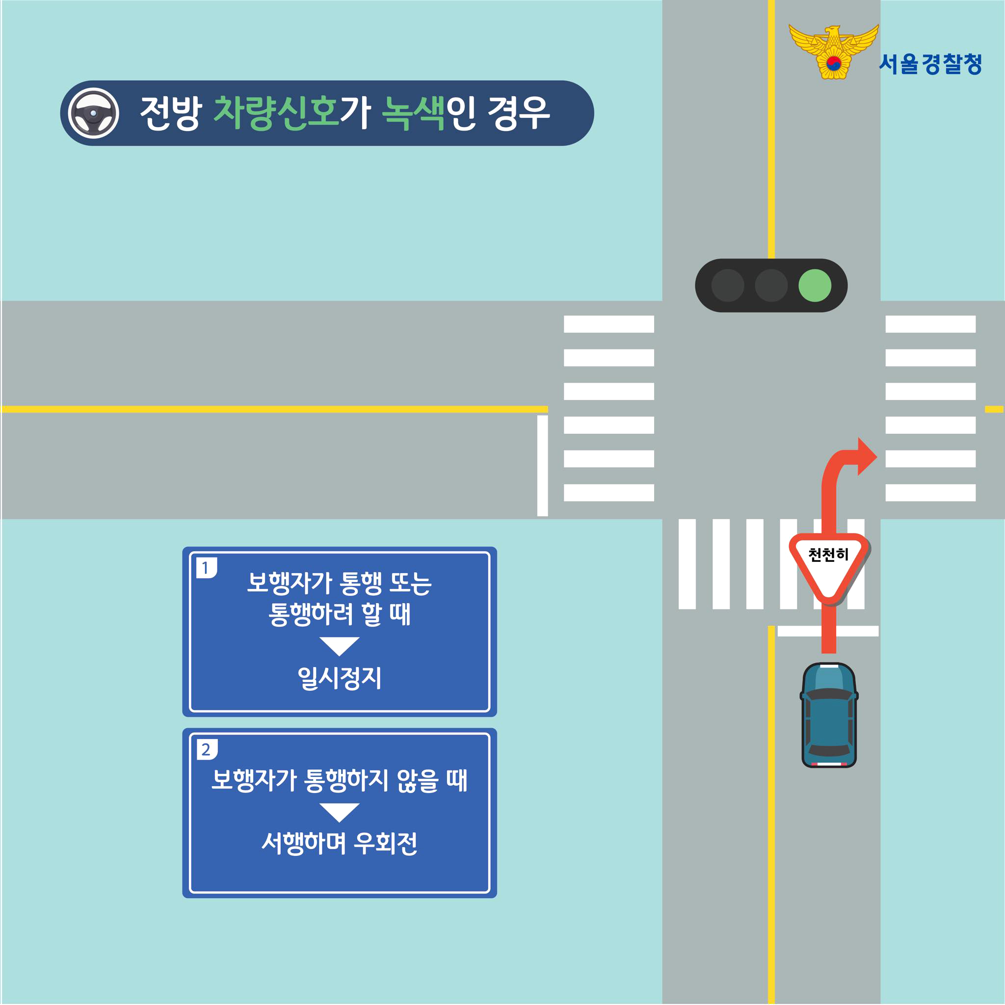 횡단보도에서 우회전 시 보행자 신호등이 초록색이면 기다리지 않아도 되나요?
