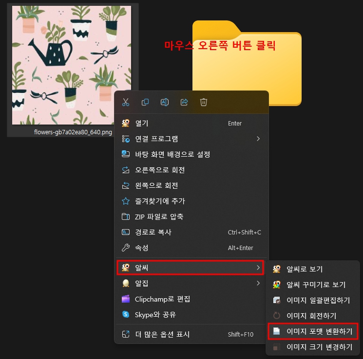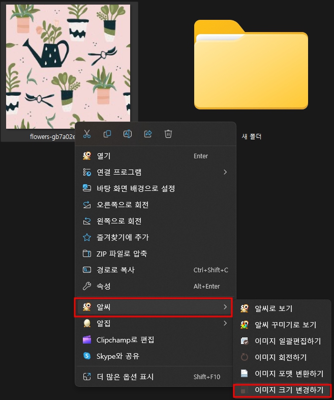 jpeg jpg 변환 방법과 마찬가지로 알씨를 이용해 이미지 크기를 변경해보겠습니다. 위치는 같고 크기 변경하기를 선택합니다.