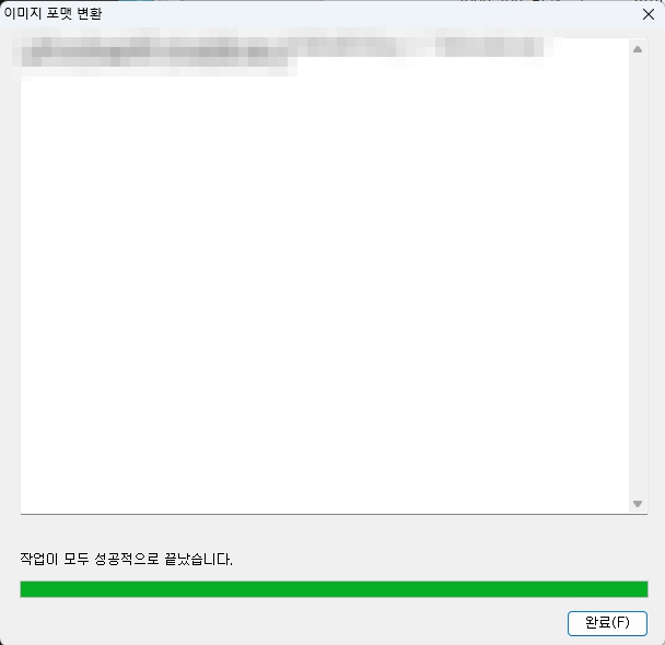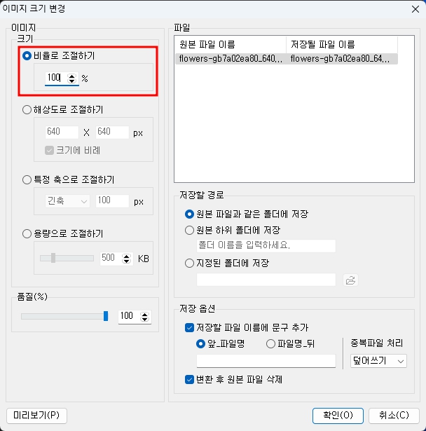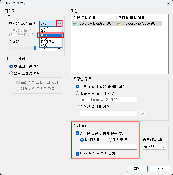 이미지 포맷 변환 창이 뜨면 변경할 파일 포맷만 확인하고 변경할 부분은 없습니다. 나중에 변경할 부분이 있으면 변경하면 될 것 같습니다. 만약 사용한 적이 없었다면 저와 다른 선택이 되어 있을텐데 저장 옵션에서 변환 후 원본 파일 삭제정도만 체크하면 좋을 것 같습니다.