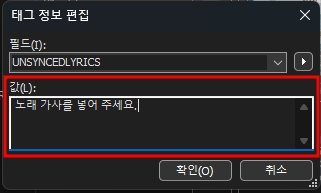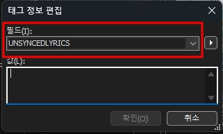 태그 정보 편집의 필드에서는 키보드 U를 치면 자동으로 설정이 됩니다. 그리고 값에는 바로 노래 가사를 넣으면 됩니다.